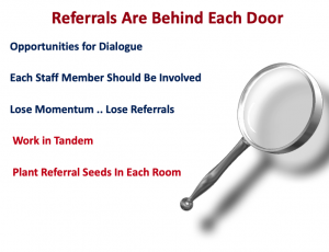 Step two is to review your patient referral system. As mentioned above, repeat business is the key to sustain any business and as a chiropractor, there is no finer affirmation of success than patient referrals. As the slide above shows behind every door is an opportunity to ask for a referral or stimulate a discussion.
