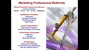 So I ask you, do you readily accept PI cases and whether yes or no, would it be a wise financial idea to explore increasing it. Hey, no one wants to be deposed or testify in court (which is less frequent today) let alone increase note taking but is it worth time and effort, you bet. So, would you like to increase your PI work? .. I can help you with this as well  .. check at the bottom of e-mail   Medical Specialists: same story, ask young students if they plan to have a professional relationship with a medical physician and they would probably resist. We chiropractors have always played defensively rather that being proactive reaching out to the internist, neurologist and orthopedists. Again, if you broke an extremity, have chronic pain which with the best of conservative care would not relent or have a visceral or neurological issue, would you not want to consult with a physician you can trust, I hope so. We can’t keep all our patients chiropractically in-house, at times a referral is necessary and welcomed by the patient. Therefore reaching out to the medical world can be helpful and creating a referral list would be beneficial. The game is to have them refer to your office as well ..  Our team can help you with this as well .. check at the bottom of e-mail Corporate Neighbors .. Industrial and Clerical: If I was to confess to the one marketing idea that worked the best for me it would always be meet and greet, actual in person workshops, health fairs, pure networking. Here again there is a specific process to make this happen. As mentioned above and last week a dedicated community liaison or marketing professional would be the best person to create the alliance, coordinate the workshops and be accountable from start to finish as well as the alliances above ..  Our team can help you with this  .. check at the bottom of e-mail