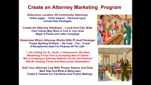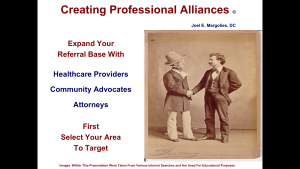 Disclaimer: I am using youtube videos to help enhance your ability to implement some of the ideas. I have no affiliation with any of the videos, the advertisements or programs.  Interested in assistance making this happen read below message This week I will concentrate on creating professional alliances. An alliance is an agreement between two parties, in our case, possibly not an agreement but an understanding that a relationship between your office and an attorney, medical physician, sports center etc. would be a win-win for everyone.  There is a process creating these alliances but to make it simple, first contact, possibly meet and then as need arises refer. Let’s take a peek at some .. by the way I can help you with this .. check at the bottom of e-mail Attorney: I remember when I taught at Life, I asked the class who will refer to an attorney when they graduate or in other words, accept PI cases. I was blown away when the vast majority did not raise their hands. I chose a few students and asked why and it seemed they knew very little about Personal Injury work. The perception was more paperwork, possible litigation, testimony and depositions. At their stage of the game it might seem scary to consider this but my next question to the class was, if they were in an accident would they consider hiring an attorney and if yes would it be wise that they referred you to a chiropractor.  Now hands were raised.