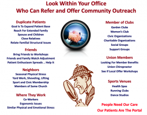 Now, some of the bigger things such as diagnostic tests, consultation skills, patient and community educational programs and pure unadulterated service with compassion and a smile.   One of my many Powerpoint presentations for chiropractors is titled: Looking for Hidden Income. Patients are already in your office so take advantage by looking within every room for ways to stimulate a referral, increase volume and income, ease the flow of patients, prevent dropouts and missed appointments all while increasing service procedures and create an alliance that bonds you, your staff with your patients and community.  In staff meeting discuss the role of each staff member and focus on how best they can communicate the purpose of their procedures along with how it can help others while weaving in conversations for referrals. These are the programs that keep your practice solvent and bullet proof.  If you want a copy of my Hidden Income presentation, lots of great slides, e-mail me: joel3639@aol.com It is yours for $30.  Just let me know and it will be downloaded to you. It is worth every syllable.   Financial responsibilities and patient policies are also a big thing that protects your bottom line before you bottom out. Clear up any patient policy ambiguities including financial and scheduling. A committed patient is a compliant patient receiving the best care and results. They are more apt to refer and help you reach your goals. Ambiguity often leads to misunderstanding and a disgruntled patient not receiving the care they deserve and worse a negative influence. Clear this small thing so you can reach the Bigger picture   Don’t forget diagnostic testing. These services, if coded and utilized correctly, are an extension of your bottom line.  Laziness costs and improper and unused equipment is a waste. Patient awareness is as important as treatment and patient knowledge of their specific problem usually is shared with others that draws them to chiropractic and you. Patient awareness is a shareable item that may cost you time to provides great dividends.