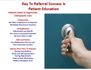 Let's Look At The Entire Office In the limited space I have within these e-newsletters, I mentioned the front desk, probably the most essential staff position. I now want to review the entire office and how an educated staff member can make a difference.  Therapy Assistants Besides the doctor, therapy assistants spend quality time with patients. While using cold laser, EMS, traction or taking an x-ray time spent should be quality time. So, have you spent time educating them how best to educate the patient. Most folks would like to know more about their care such as how muscle stimulation reduces spasms, how cold laser reduces pain, how traction mobilizes the joint and how orthotics assists with spinal balance, how specific supplements provide nutrition to hungry cells and why your office provides this a combined effort to your patients and why their family and friends could benefit as well.