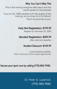 In his case, he found new excitement with technique and studied how best to assist his patients beyond the established norms of manipulation whether by hand or instrument. He perfected this technique and over the years has assisted his community along with referrals from other chiropractors with great success as well as sharing his knowledge with cost effective and hands on seminars. Scroll to the bottom of the page to register for his December Atlanta seminar. You can reach him at: incomedoctor@aol.com or call 770-853-7940 to schedule a seminar in your area.